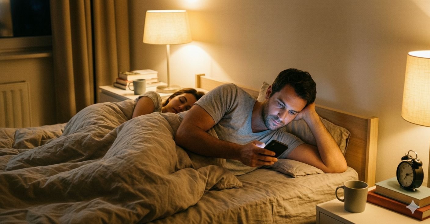 Homem acessando sites enquanto a mulher dorme ao seu lado. (Foto meramente ilustrativa)