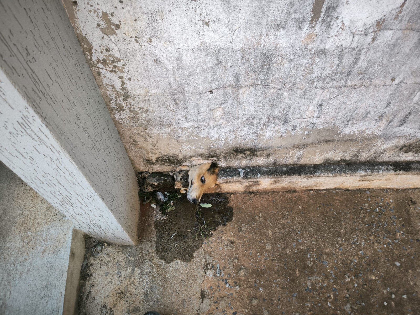 O animal estava com a cabeça imobilizada em uma saída de água localizada na base do muro de uma residência. Com o auxílio de marreta e talhadeira, os bombeiros abriram espaço na tubulação com muito cuidado, garantindo que o cão não se ferisse.