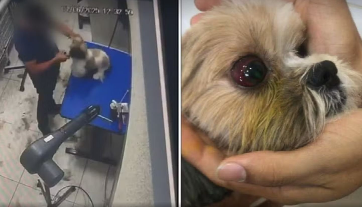 Funcionário temporário filmado espancando a cadela durante tosa; ela está estável após sofrer lesão no olho, mas manteve a visão