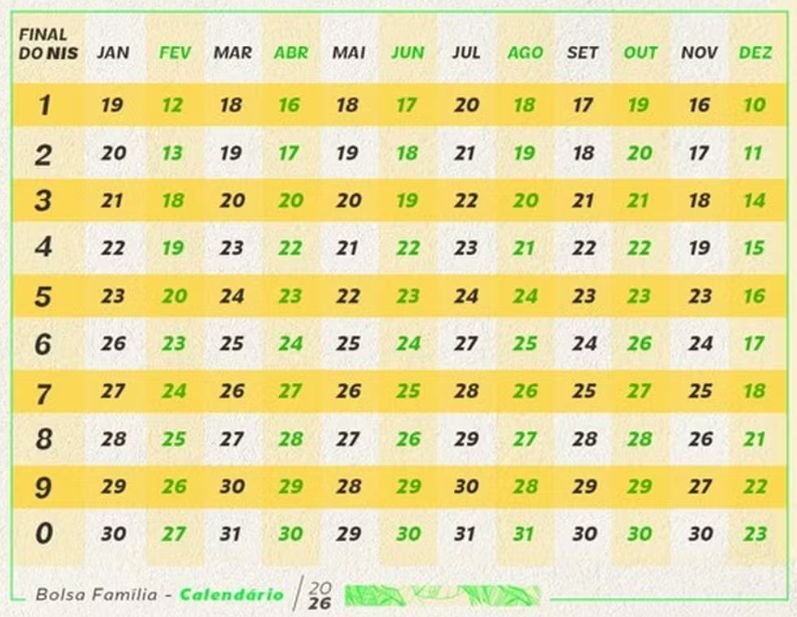 Em janeiro, os pagamentos começam no dia 19 para beneficiários com NIS final 1 e seguem até o dia 30, quando recebem aqueles com NIS final 0. As datas completas podem ser consultadas nos canais oficiais do governo.