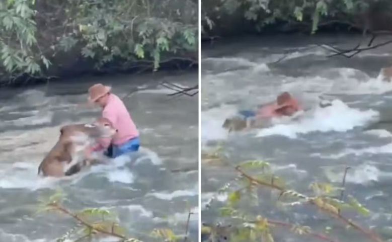 Animal foi puxado pela força da água, e homem caiu no rio durante o resgate. Episódio chamou atenção nas redes sociais.