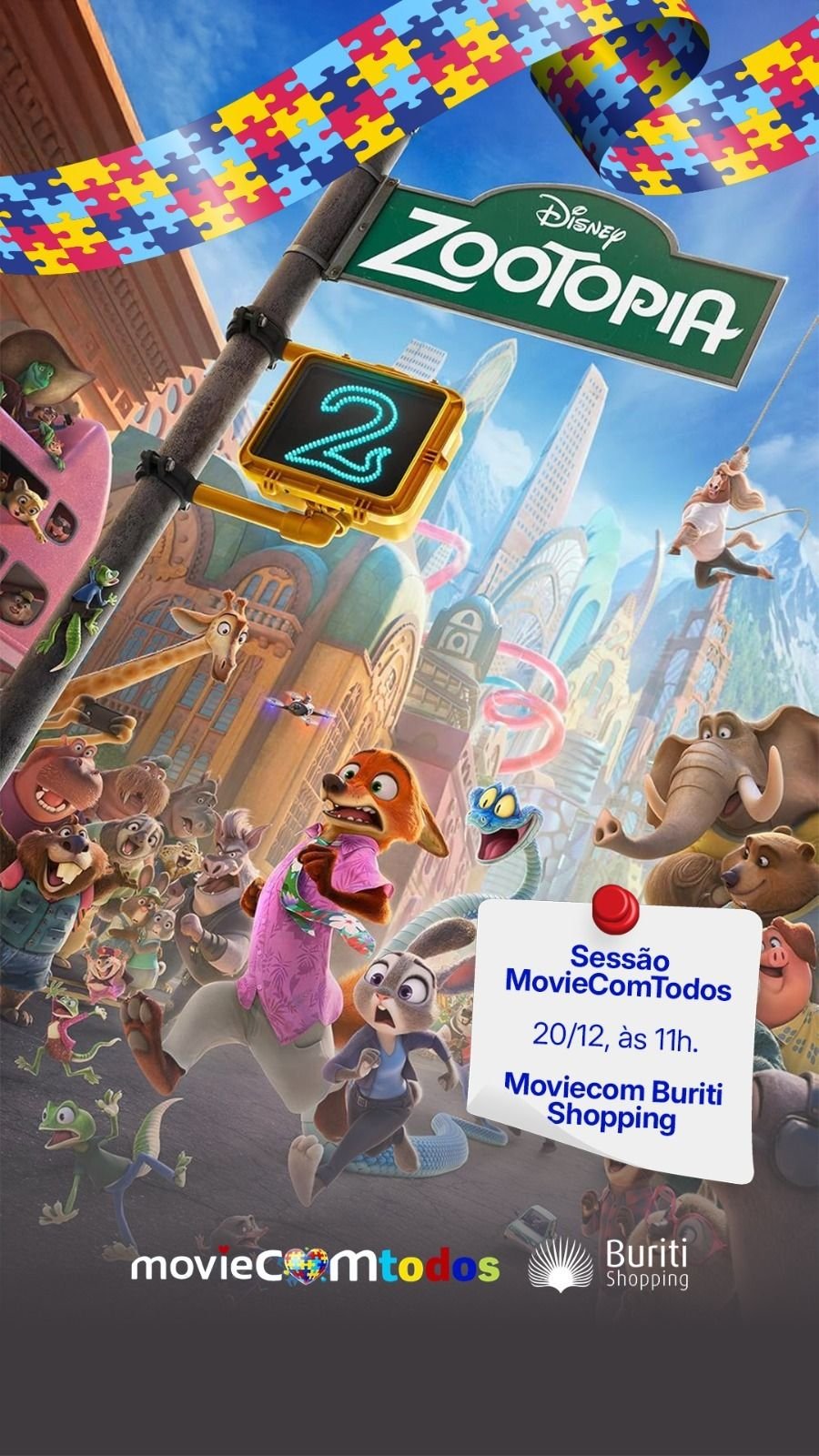 No próximo sábado, 20 de dezembro, às 11h, o Moviecom do Buriti Shopping, em Aparecida de Goiânia, promove uma sessão de cinema adaptada do filme “Zootopia 2”, especialmente pensada para crianças com Transtorno do Espectro Autista (TEA) e suas famílias. Crianças com TEA e um acompanhante têm direito à meia-entrada. Os ingressos são vendidos exclusivamente na bilheteria do cinema, mediante apresentação de laudo ou carteira de identificação.