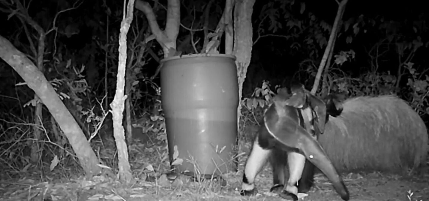 Um vídeo mostra o momento raro em que uma mamãe tamanduá-bandeira (Myrmecophaga tridactyla) caminha pelo Parque Estadual da Serra de Caldas Novas (Pescan) com filhotes gêmeos nas costas, em agosto deste ano. O registro foi feito por armadilhas fotográficas espalhadas pelo parque para fins de pesquisa e proteção da biodiversidade.