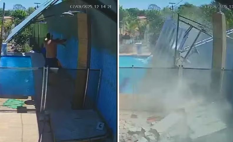 Dois homens ficaram feridos em Avelinópolis, na região oeste de Goiás, após um muro desabar sobre uma piscina no domingo (7). Um vídeo de monitoramento mostra o momento em que eles observavam o telhado colocado sobre a estrutura antes da queda.