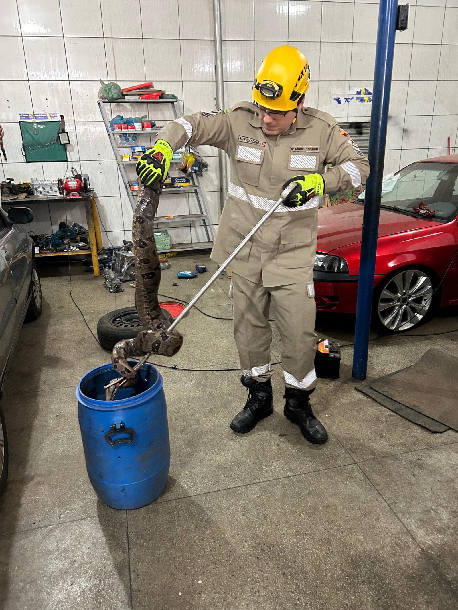 Uma ocorrência inusitada mobilizou o Corpo de Bombeiros de Trindade na manhã da última quinta-feira, 12 de junho. Uma jiboia com mais de um metro de comprimento foi encontrada por funcionários no interior de uma oficina mecânica situada na Avenida Trindade, no Setor Maysa.