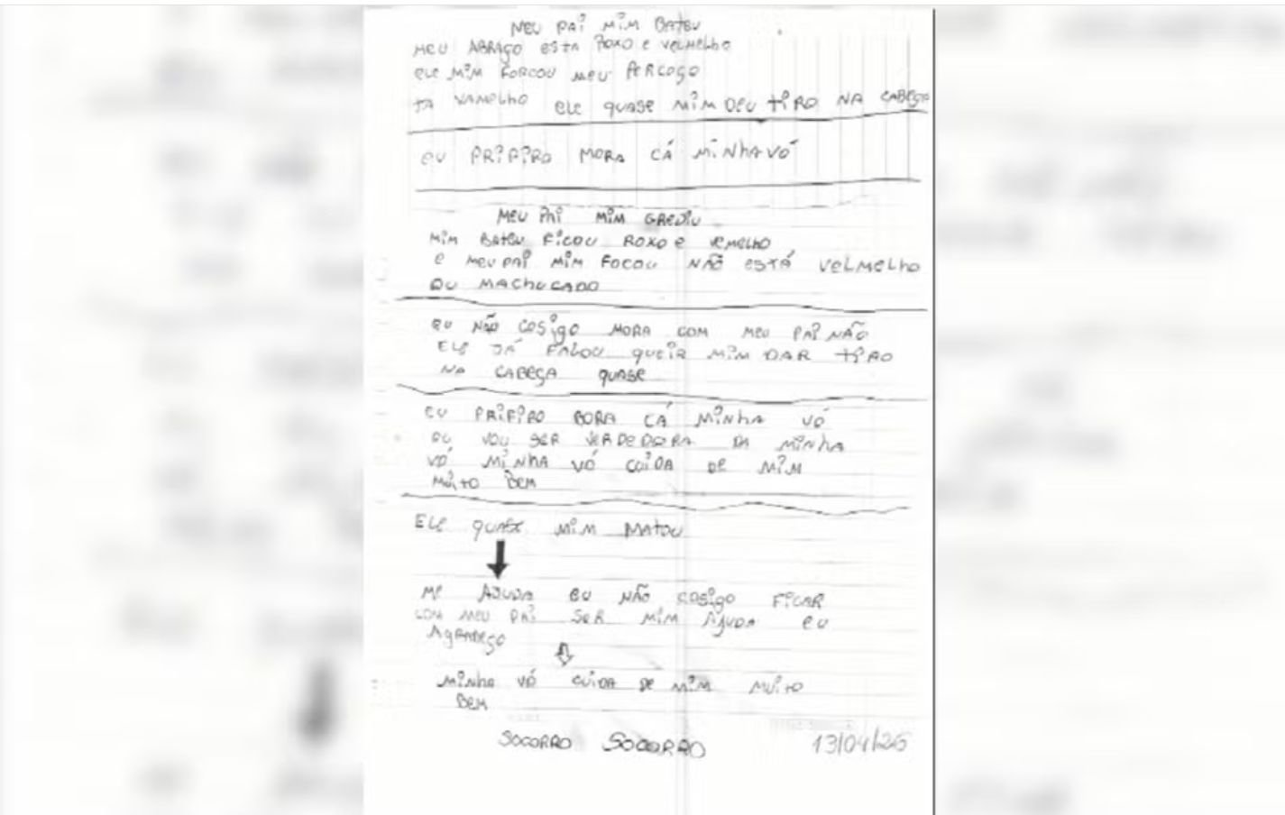 No documento, a estudante relata ter sido agredida pelo pai, incluindo episódio de enforcamento, além de mencionar ameaças contra sua vida. O conteúdo também indica o desejo da adolescente de deixar a casa e morar com a avó.