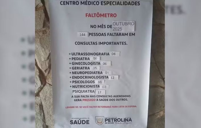 Em uma iniciativa para reduzir o número de ausências em consultas médicas, o Centro Médico de Especialidades de Petrolina de Goiás instalou um painel conhecido como “faltômetro”. O equipamento contabiliza as faltas de pacientes e foi implementado pela Secretaria Municipal de Saúde após constatar alto índice de não comparecimento.