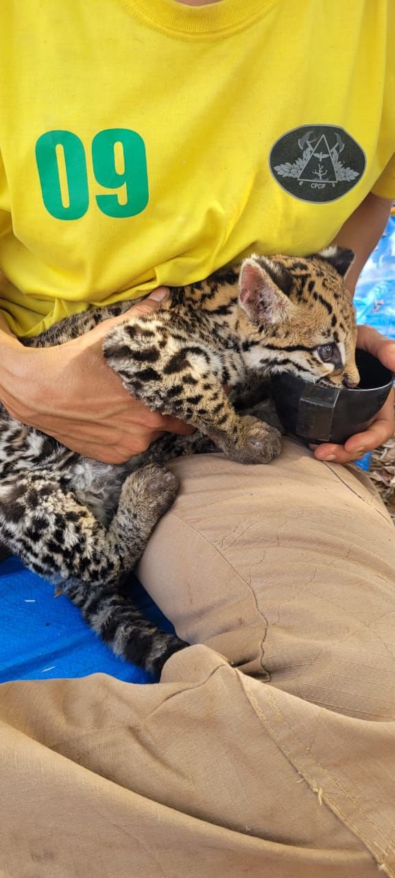 Um filhote de jaguatirica com as patas queimadas foi resgatado durante um combate a incêndio florestal na Serra Dourada, em Goiás, ocorrido nesta semana,  realizado por equipes do Curso de Prevenção e Combate a Incêndio Florestal (CPCIF).